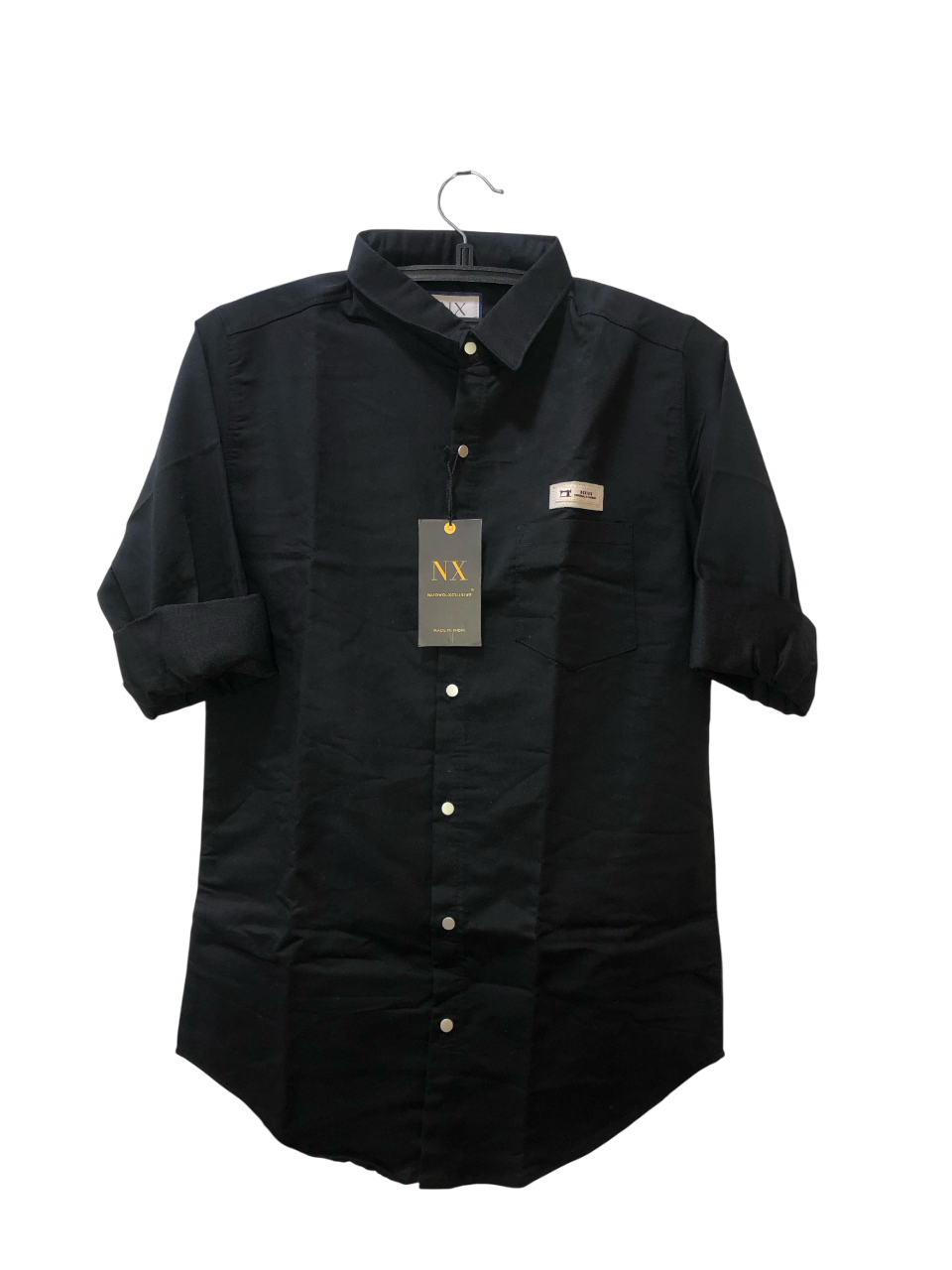 Unleash bold simplicity with the NX Jet Black Cotton Shirt – your go-to for versatile, smart-casual looks. Featuring a clean silhouette, crisp button-down front, and a signature stitched logo patch on the pocket, this shirt is a must-have essential for the modern wardrobe.
